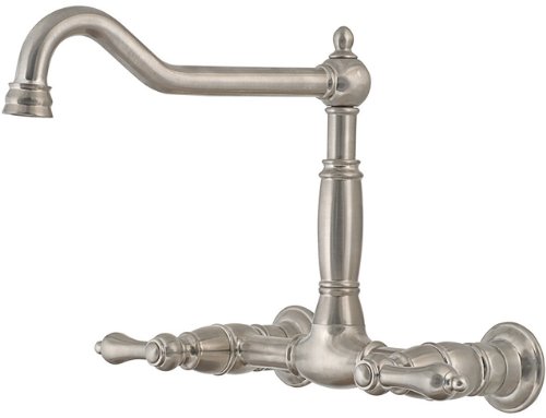 This Belle Foret Wall Mount kitchen faucet is designed for 2 hole installation onto your wall above the sink. Faucet features double lever handle temperature control and an elegant victorian spout, which will instantly transform the look of any kitchen! Ceramic disc cartridges ensures smooth performance with every use.ulliWall Mount Kitchen Faucet/lili2 hole installation/lili8in centers/lili8 9/16in Spout reach/lili6in Aerator clearance/lili9 1/8in Spout reach/liliCeramic disc cartridge/liliMetal lever handle/liliBrass construction/li/ul