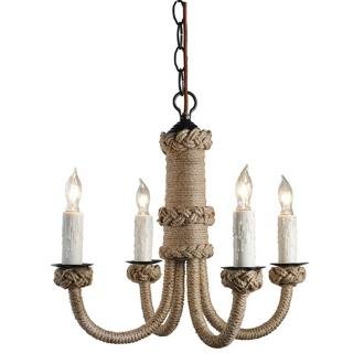 Featuring a striking frame wrapped in woven jute, this distinctive 4-light chandelier is a perfect addition to a tropical or island decor theme. Woven jute wrapped frame. Antique bronze finish metal. Takes four 40 watt bulbs (not included). Includes 8 feet of chain. 20 1/2" wide. 21" high. 5" wide canopy. Hang weight of 8 lbs.